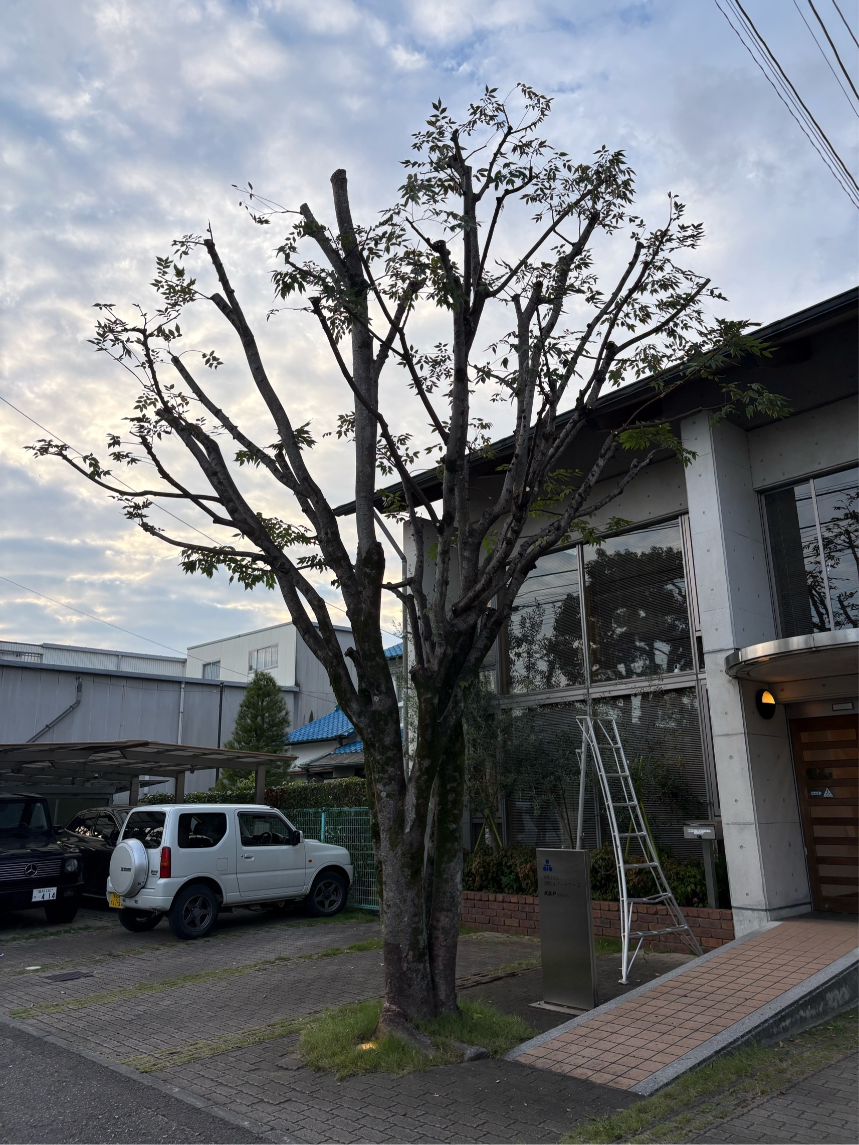 剪定後は、鬱蒼と茂っていた枝葉が整理され、事務所前がすっきりと明るい印象に。風通しや日当たりも改善し、建物全体が清々しい雰囲気に生まれ変わりました。