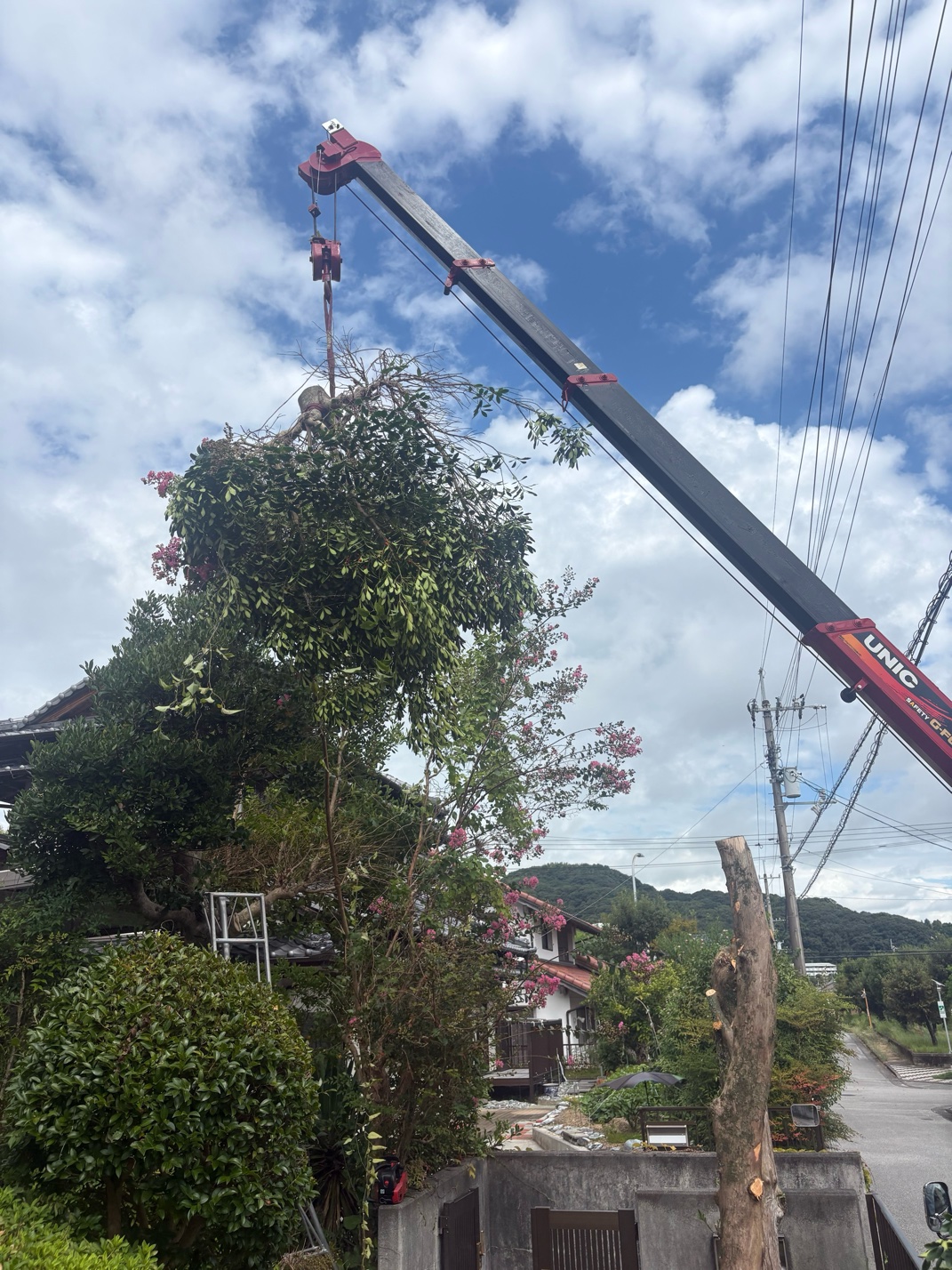 「とても高くて自分では手が出せなかった木を、クレーンを使って安全に伐採してくれてありがとうございました。高い木がなくなったおかげで、これからは自分たちでも管理できそうです。庭が明るくなって嬉しいです!」